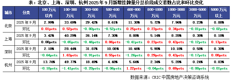 (2)上海、深圳中高改业主较为活跃,9月总价500-600万元和800-3000万元房源占比显著回升的特征;高端房源占比持稳,波幅较小。