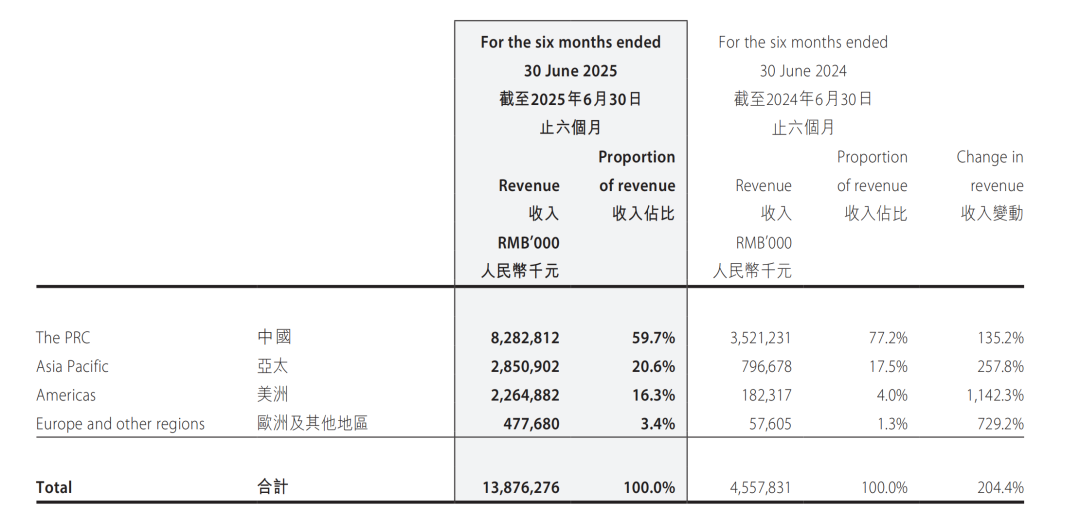 今年上半年,美洲市场营收的占比排在中国、亚太之后位列第三,达到16.3%,但其同比增速却达到令人瞠目结舌的1142%,去年同期的占比仅仅是4%。