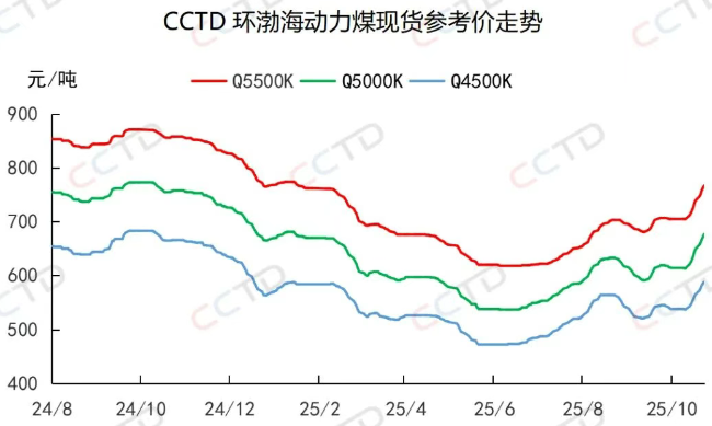 产地市场来看,下半年以来,受降雨频繁、安监趋严等因素影响,国内煤炭供应持续低位运行。进入11月份,正值用煤旺季,产地煤炭供应或有所增加,但按照2025年度中央安全生产考核巡查工作安排,22个中央安全生产考核巡查组将陆续进驻31个省、自治区、直辖市和新疆生产建设兵团开展年度考核巡查,产地煤炭产能释放是否受限尚未可知,整体供应增量空间存在不确定性。