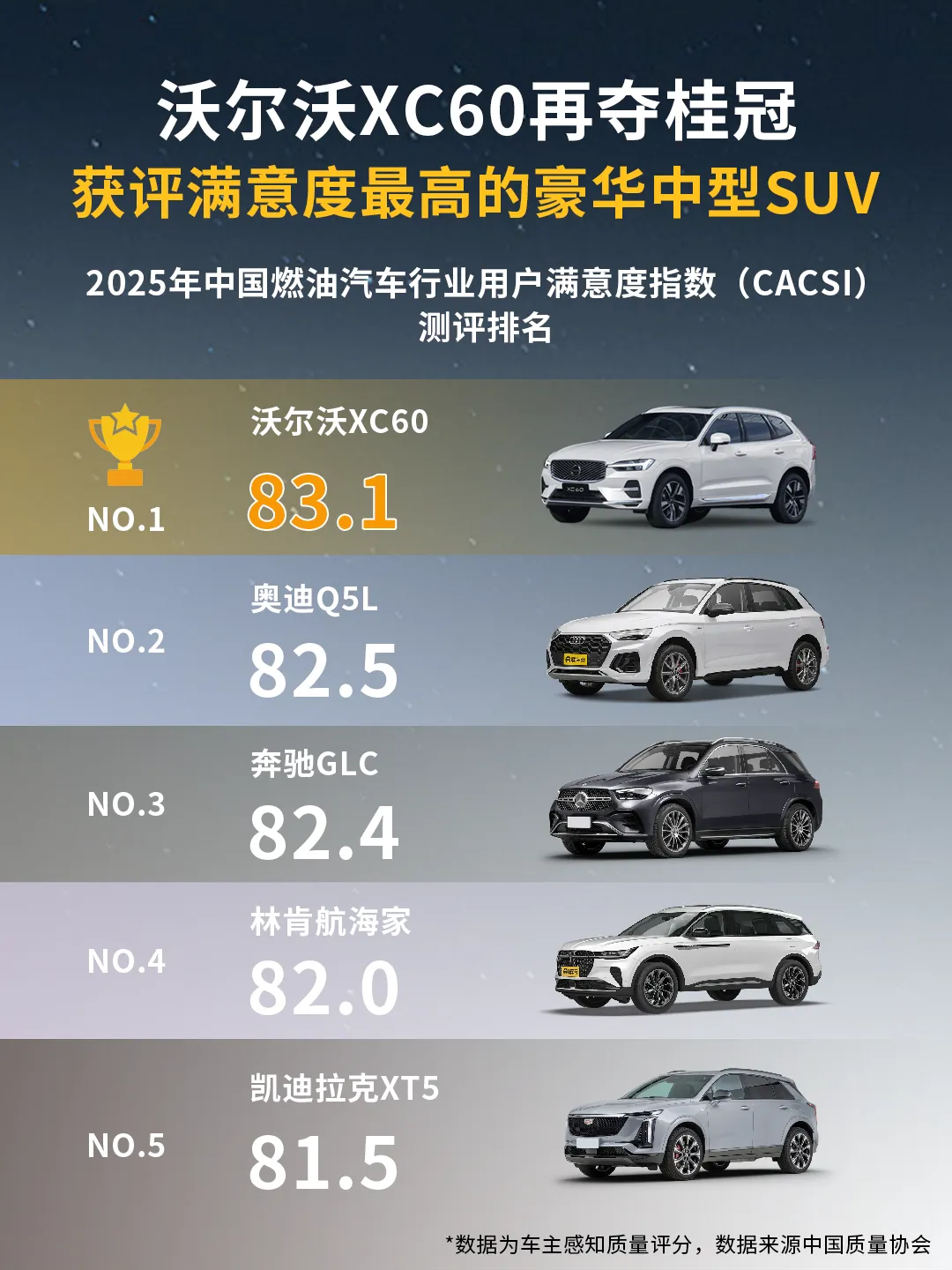 2025年中国汽车行业用户满意度测评(CACSI)给出了答案。沃尔沃明星车型XC60凭借综合实力摘得“豪华中型 SUV 满意度第一名”;更值得关注的是,品牌已连续两年获得“豪华品牌售后服务满意度第一名”,实现核心领域的双重突破。