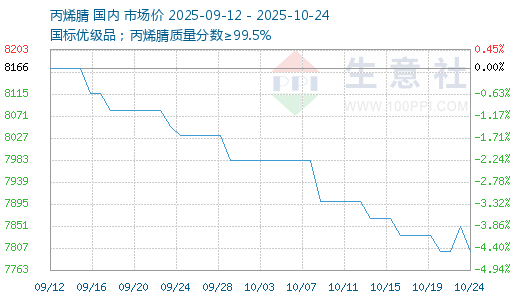 本周基本面暂无明显改观,整体供应宽松且短期内无减量预期,需求则整体维持,买盘按需采购为主,丙烯腈厂商继续降价。截止10月24日,华东港口主流出罐自提价7800-7900元/吨,较上周下跌50-100元/吨;山东市场短途送到7800-7900元/吨,较上周下跌50元/吨。