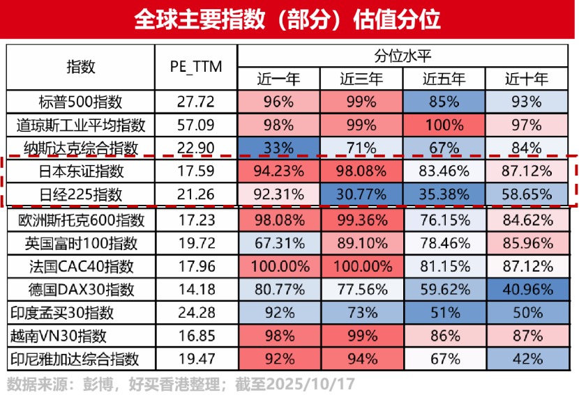 此外,尽管年初至今日本股市表现出强劲的追赶势头,但与全球主要股指相比,其估值仍存在补涨空间。
