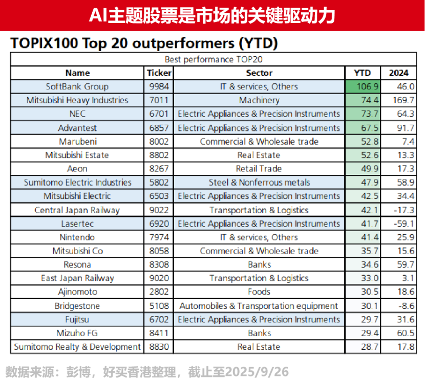 其中,AI相关板块是本轮行情中的关键动力。年初以来,东证100指数中表现最佳的股票,如软银集团和Advantest(爱德万测试),大多与AI和科技主题紧密相关。