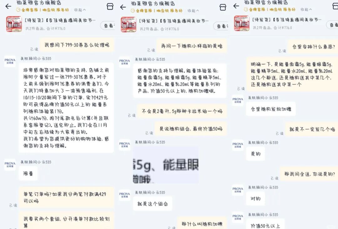 其中,珀莱雅对于未领到限时799-30店铺券的消费者,也给予补偿措施:参与预售的消费者,加赠价值50元以上的能量系列随机体验装。