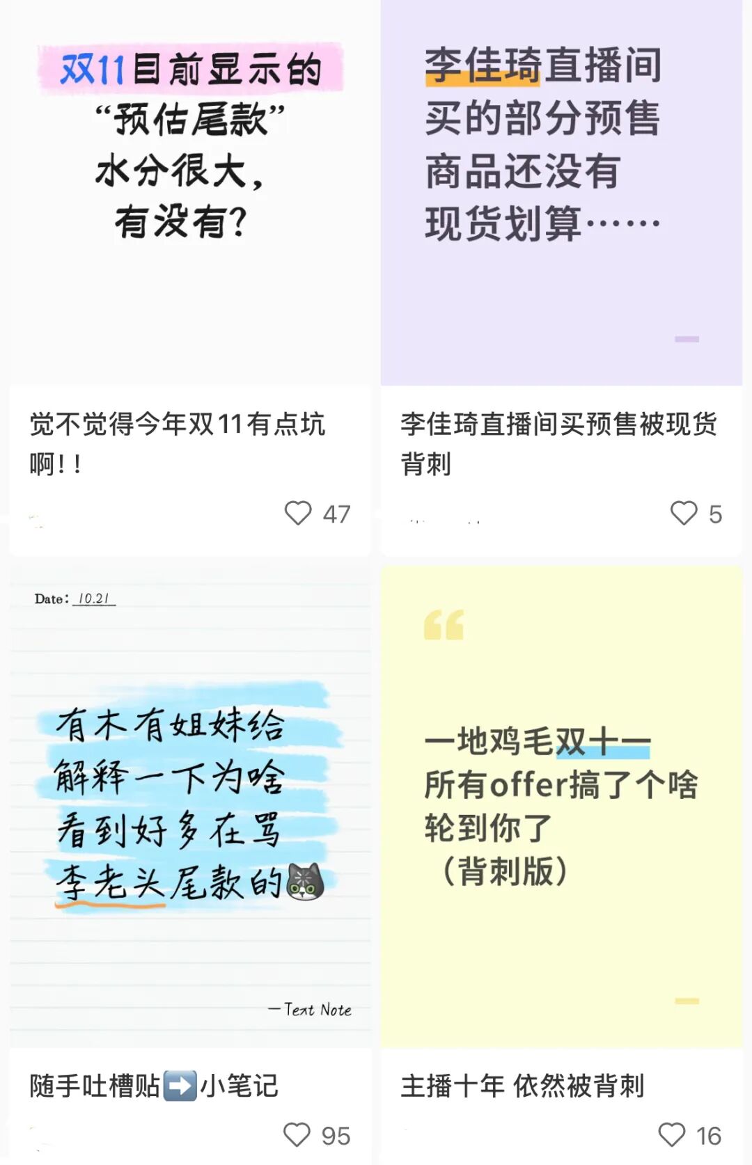 深究背后,聚美丽发现,造成这类笔记的大批量出现与传播的原因,除了一贯的大家在双11期间对李佳琦动态格外关注,本次还存在因部分产品在现货开售阶段的价格,低于部分消费者在预售领红包、凑单的价格,突破了李佳琦作为“超头”的最低价格,导致消费者不满,在各平台发帖维权。