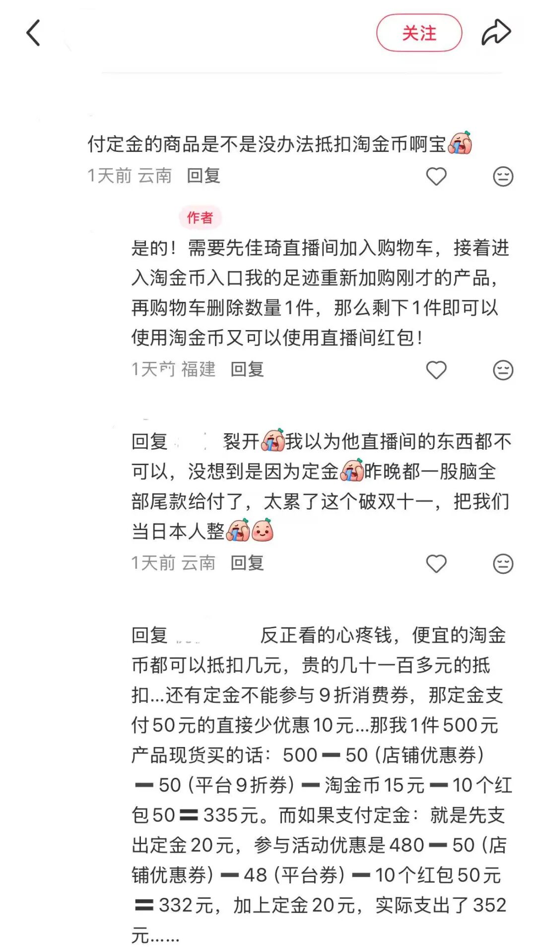 而除了平台随机发放薇诺娜限时补贴,还有消费者反映平台机制不清晰,如付定金不能用淘金币、9折优惠券,现货直接买更便宜等现象。