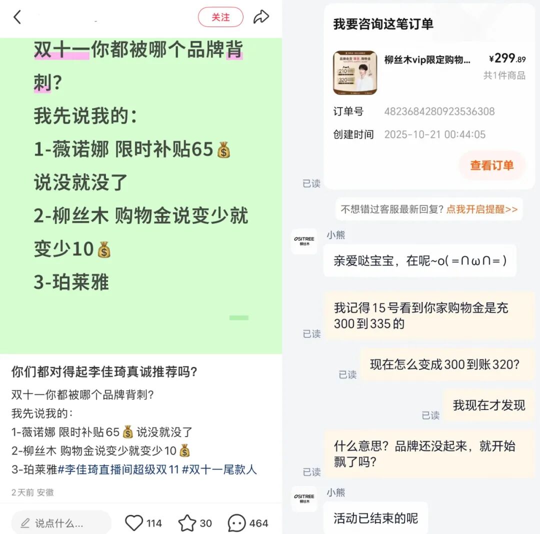 而新锐品牌柳丝木在双11预售开始前购物金充值300到账335,而活动开始后则变为300到账320,客服回应“活动已结束的”等情况。