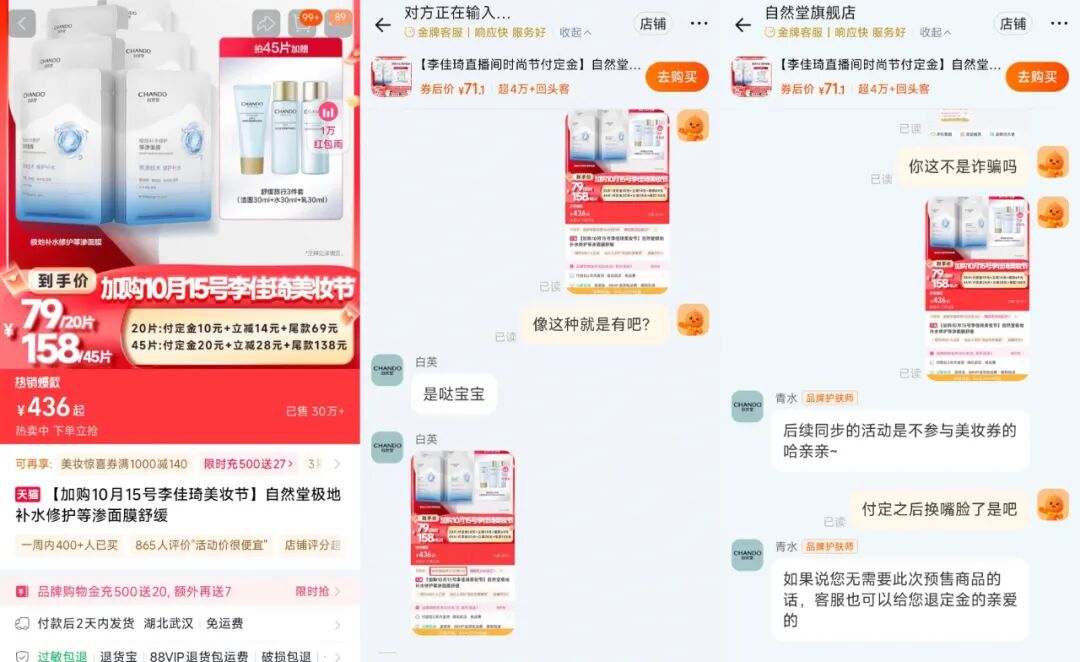 而自然堂在本次双11预售开始前表示产品参与美妆惊喜券优惠,但预售开始后,因平台问题无法参与该次满减活动,导致消费者实际支付价格增多。