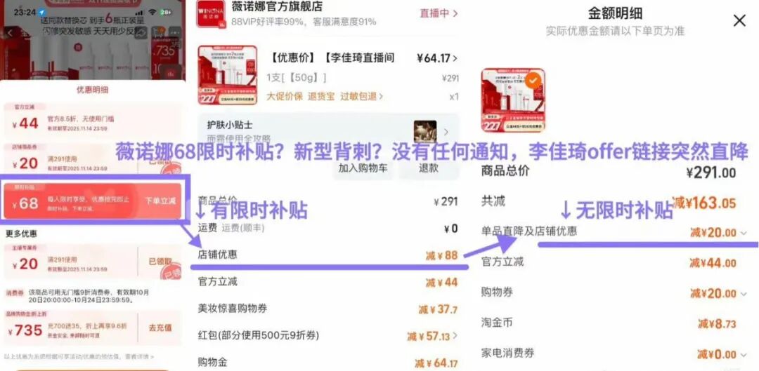 不过,薇诺娜对于20日晚23点发放的少量立减68元的优惠券,表示并不知情,经与主播和平台方沟通,表示该批优惠券系平台随机限时发放,与品牌方无关。