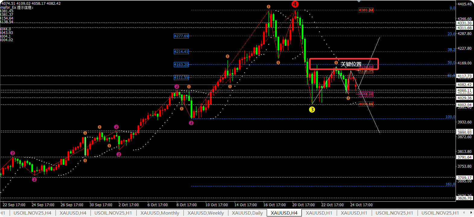 上周一价格触顶4381后周二价格暴跌至周三低点4004一线;之后价格就维持在4044-4160区间震荡。因此我们目前上方只需要关注4161-4144一带的阻力压制即可,只有破位以上才有可能继续上行。