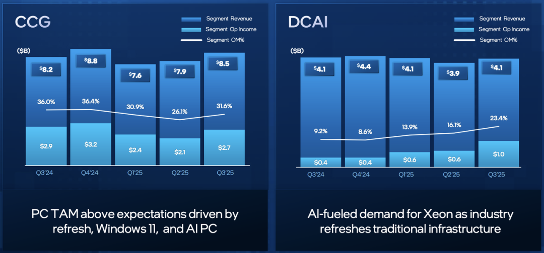 ◎客户端计算业务(CCG)仍是英特尔的营收支柱,本季度收入85亿美元,同比增长5%。PC市场的回暖为该业务提供了坚实支撑。英特尔预计2025年全球PC出货量可达2.9亿台,同比增长超过8%。