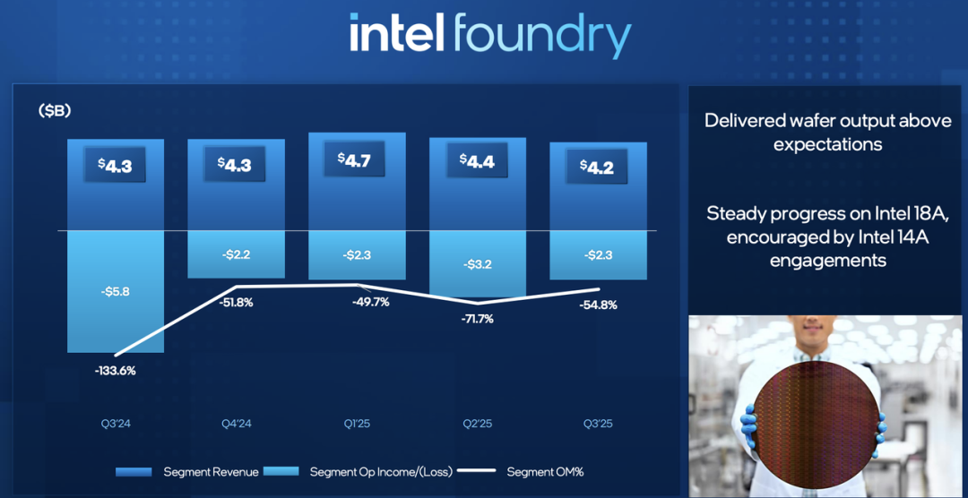 本季度该业务实现收入42亿美元,同比下降2%,英特尔正以约1000亿美元的长期资本开支重塑其代工体系,目标是在2026年前进入全球前三。