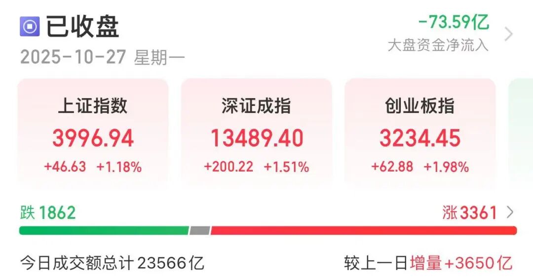 截至收盘,上证指数涨1.18%,收于3996.94点;深证成指涨1.51%,创业板指涨1.98%。全市场成交额超2.35万亿元,超3300只个股上涨。