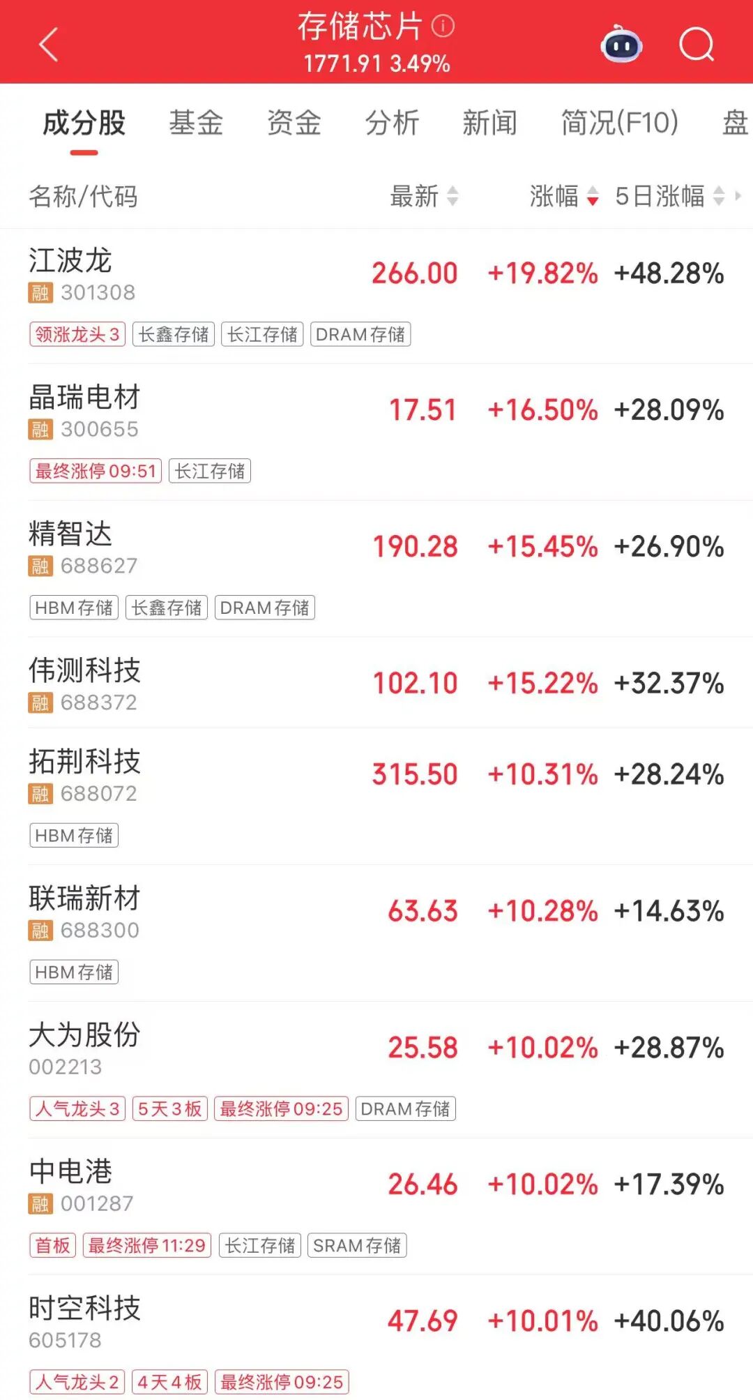 午后,存储芯片板块上攻,江波龙、拓荆科技、伟测科技、佰维存储等多股盘中股价创历史新高。大为股份、中电港、德明利、时空科技等多股涨停。