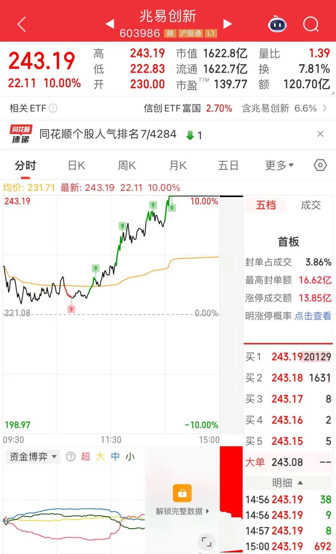 兆易创新午后涨停,股价创历史新高,截至收盘报243.19元/股,最新市值为1622.8亿元,成交额为120.7亿元。