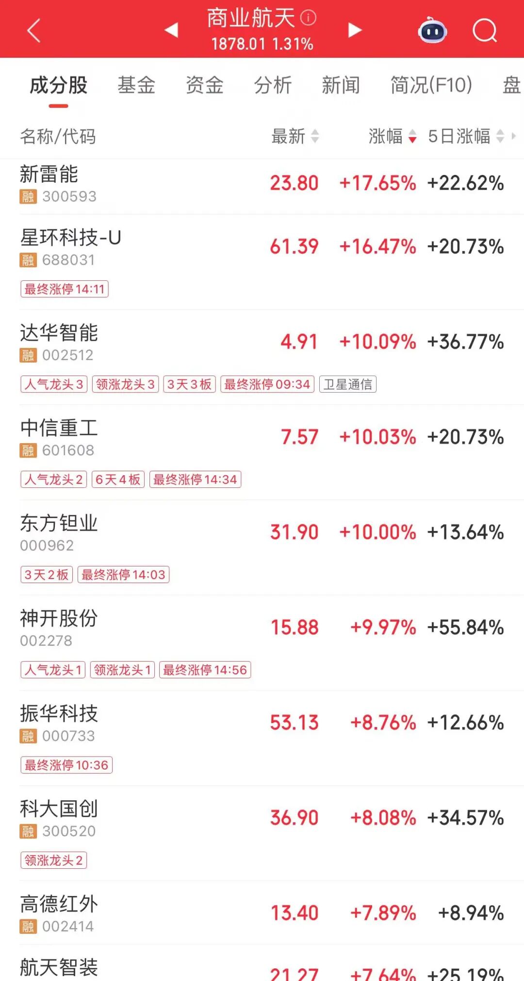 今日午后,商业航天板块震荡走高。截至收盘,达华智能、中信重工等多股涨停,新雷能涨超17%,高德红外、航天智装等涨幅居前。