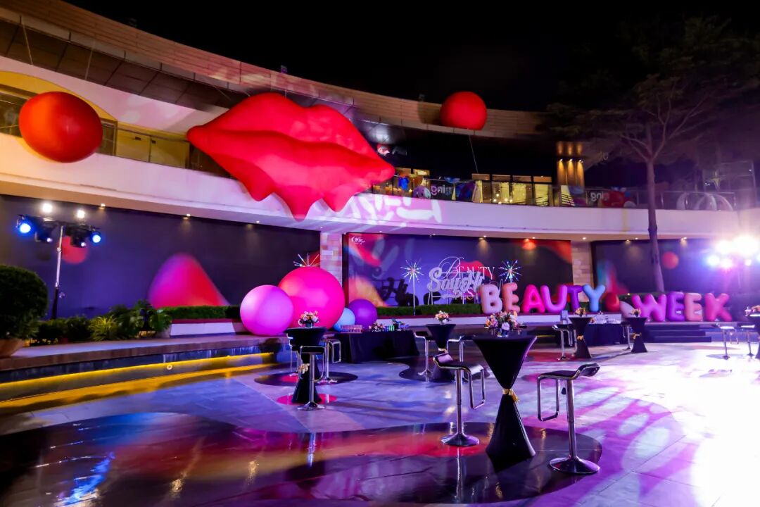 厦门宝龙一城则依托“高化品牌”矩阵优势,策划首届美妆节,强化了其城市“美妆消费目的地”的主题化标签。同时,结合水幕广场的空间结构特点,打造巨物美陈,通过极具视觉冲击力的场景,扩大了美妆节活动的声势。