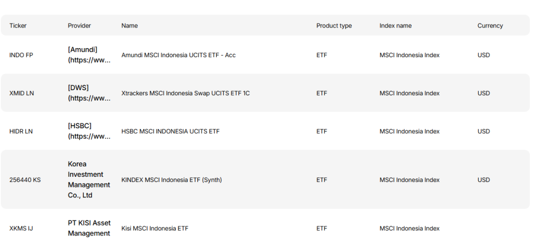 明晟公司官网显示,跟踪MSCI印尼指数的ETF基金有5只,但没有公布具体规模。