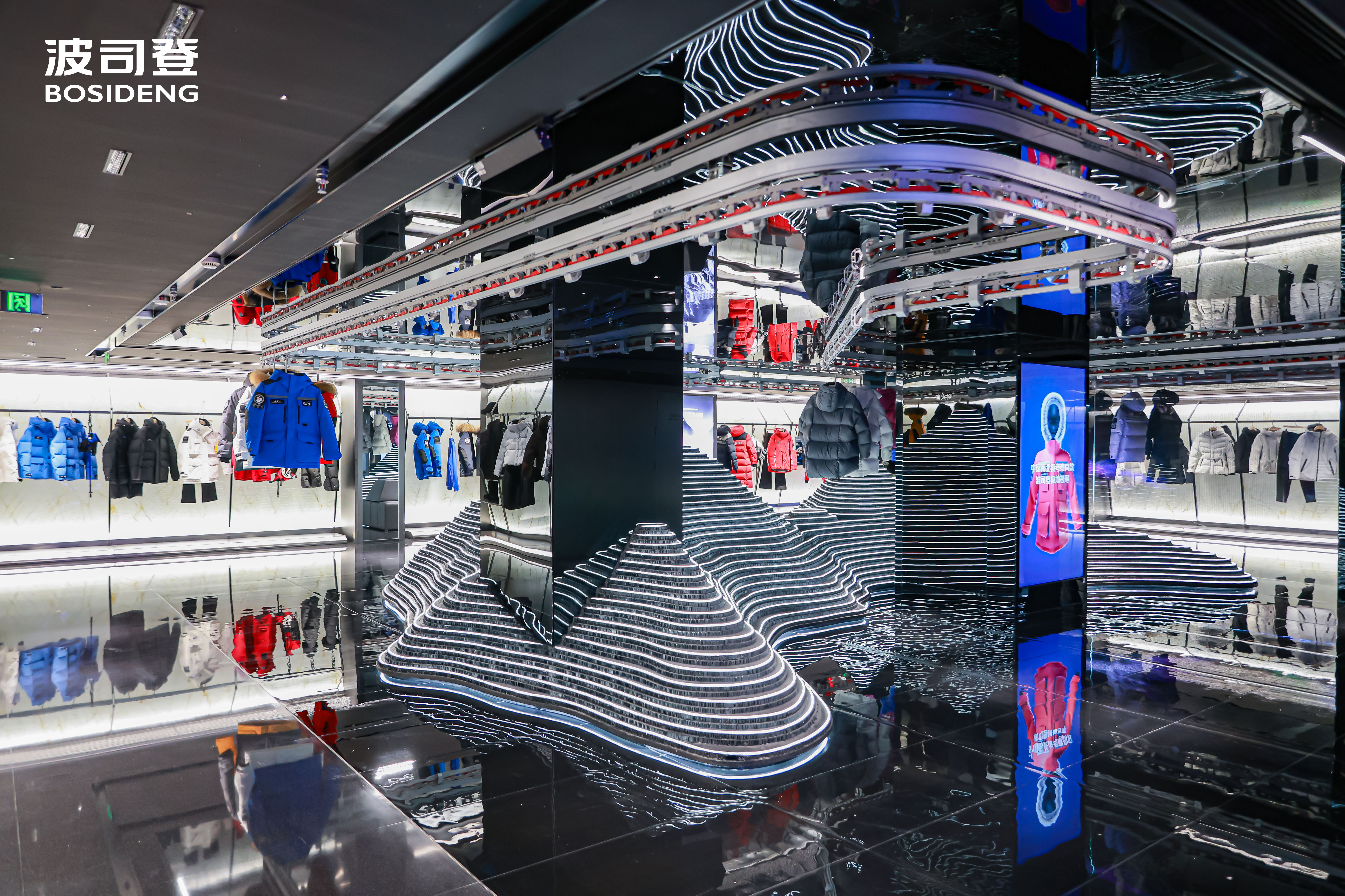 主楼梯本身即为珠峰装置,拾级而上如致敬攀登。模拟衣拿系统环绕珠峰等高线展示秀款,结合透明屏互动,诠释“登顶,只是新起点”的探索精神。