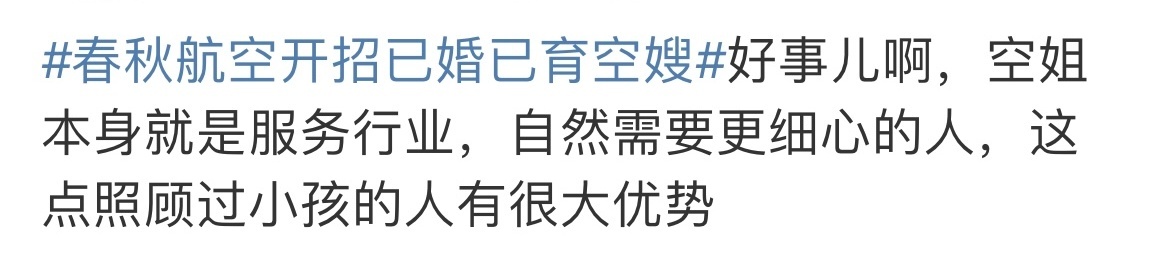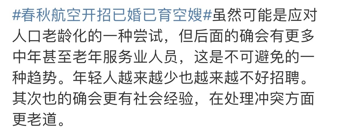 据现代快报报道,春秋航空工作人员解释称,早些年在民航业内就有“空嫂”的提法,主要是为了和未婚未育应聘者进行区分。“就岗位工作性质、工作内容等而言,空姐和空嫂是没有区别的,此举旨在优化客舱服务,提升旅客出行体验。”