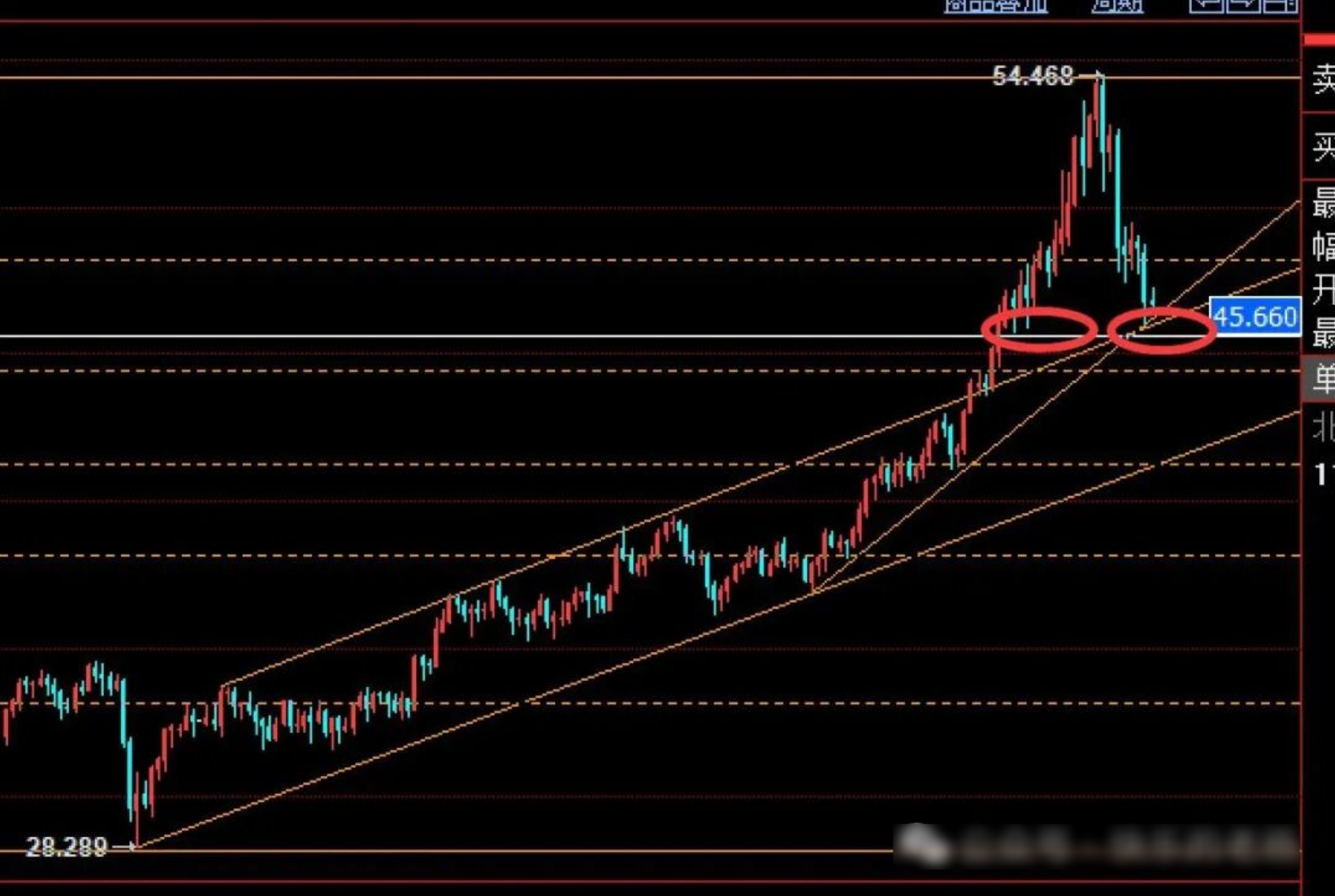 国际白银,昨天和黄金一起暴跌,逼近中期支撑45-46区域,抵达区间后着手买多,以下45-44.5作为风控。但,短期而言,依然空头,日内47.2及47.8-48区域压制继续高空。需要注意的是,45区域一旦下破多头需要规避风险!