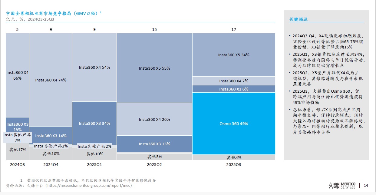 全景相机的市场格局也迎来激烈变动。大疆于今年7月31日入局该领域,在不到三个月的时间内,其首款全景相机Osmo360,凭借跨端应用与高性价比的优势,分别在中国电商渠道获得了49%的市场份额,全球市场份额达43%。加速推动全球全景相机市场格局重构。