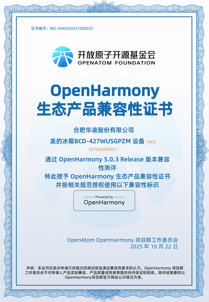 在当前智慧家庭发展的深水区,设备间的“生态割裂”与“连接碎片化”已成为阻碍用户体验提升的核心瓶颈,行业竞争正从单品比拼全面转向生态化发展新阶段。在此背景下,近日,美的冰箱BCD-427WUSGPZM设备正式通过OpenHarmony5.0.3Release版本兼容性测评,荣获冰箱品类首个开源鸿蒙生态产品兼容性证书(证书编号:NO.OAOH20251000032)。这一突破标志着智能家电在生态互联上迈出关键一步,为智慧家居的破局提供了具象化落地案例。