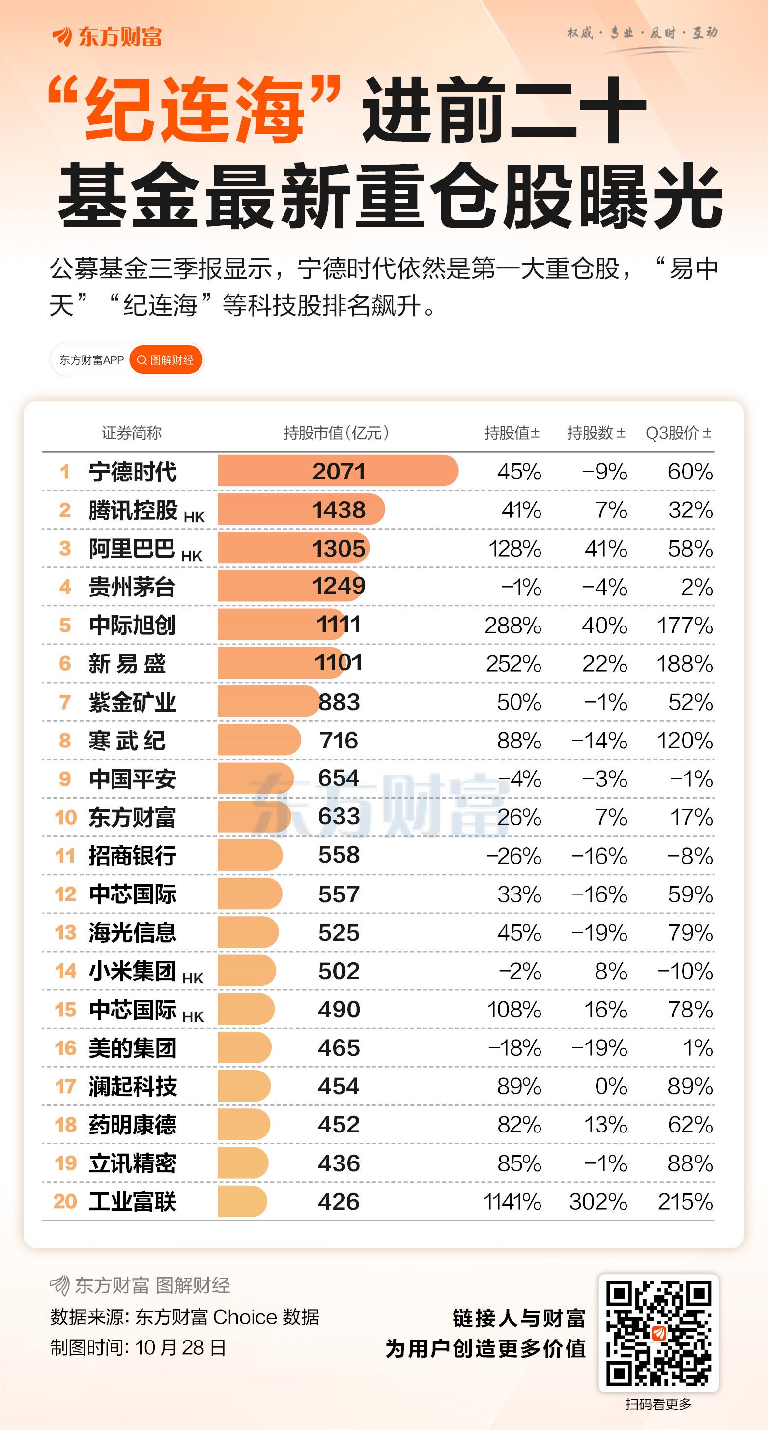 此外,前二十大重仓股中,可谓“科技感”满满。比如“易中天”(新易盛、中际旭创、天孚通信)、“纪连海”(寒武纪、工业富联、海光信息)这6家公司中,只有天孚通信不在前二十,中际旭创、新易盛、寒武纪甚至挤进前十。