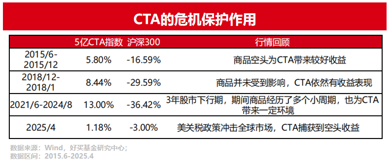 CTA的配置作用体现在两方面,一是其与传统股债资产相关性较低。二是股市剧震的危机时期,CTA很可能发挥“危机保护”的作用。