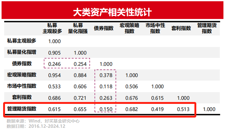 以上统计了2017年到2024年各类私募产品的相关性。可以看出,CTA与股票私募的相关性约0.6,与债券私募的相关性则仅0.15。