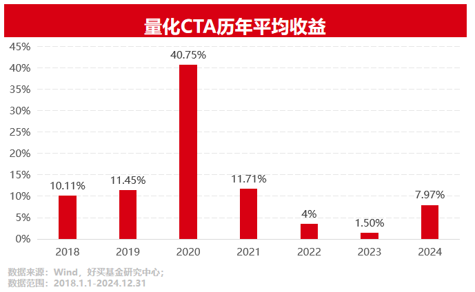 以上统计了2018年到2024年,量化CTA策略的平均业绩表现。可以看到,CTA产品的业绩分布可能较不均匀,即多数年份赚小钱,少数年份赚大钱。这样的收益模式,可能会使得不少投资者在收益小年失去耐心,选择离场,结果错过了随后的收益大年。
