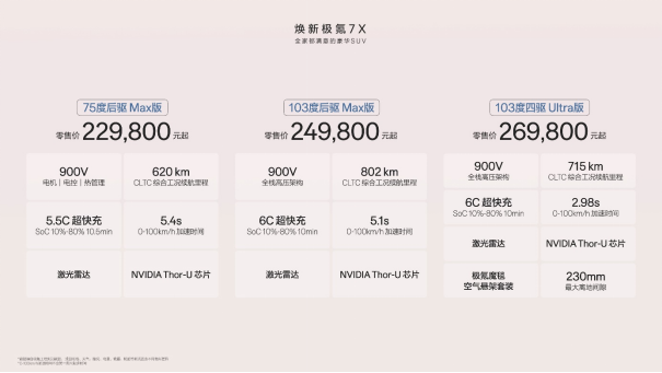 10月28日,极氪7X焕新上市,新车共推75度后驱Max版 、103度后驱Max版、103度四驱Ultra版三款配置版型,官方零售价分别为229,800元、249,800元和269,800元。超级置换权益后限时售价分别为219,800元、239,800元和259,800元。即日起,用户可通过极氪官方渠道预定。