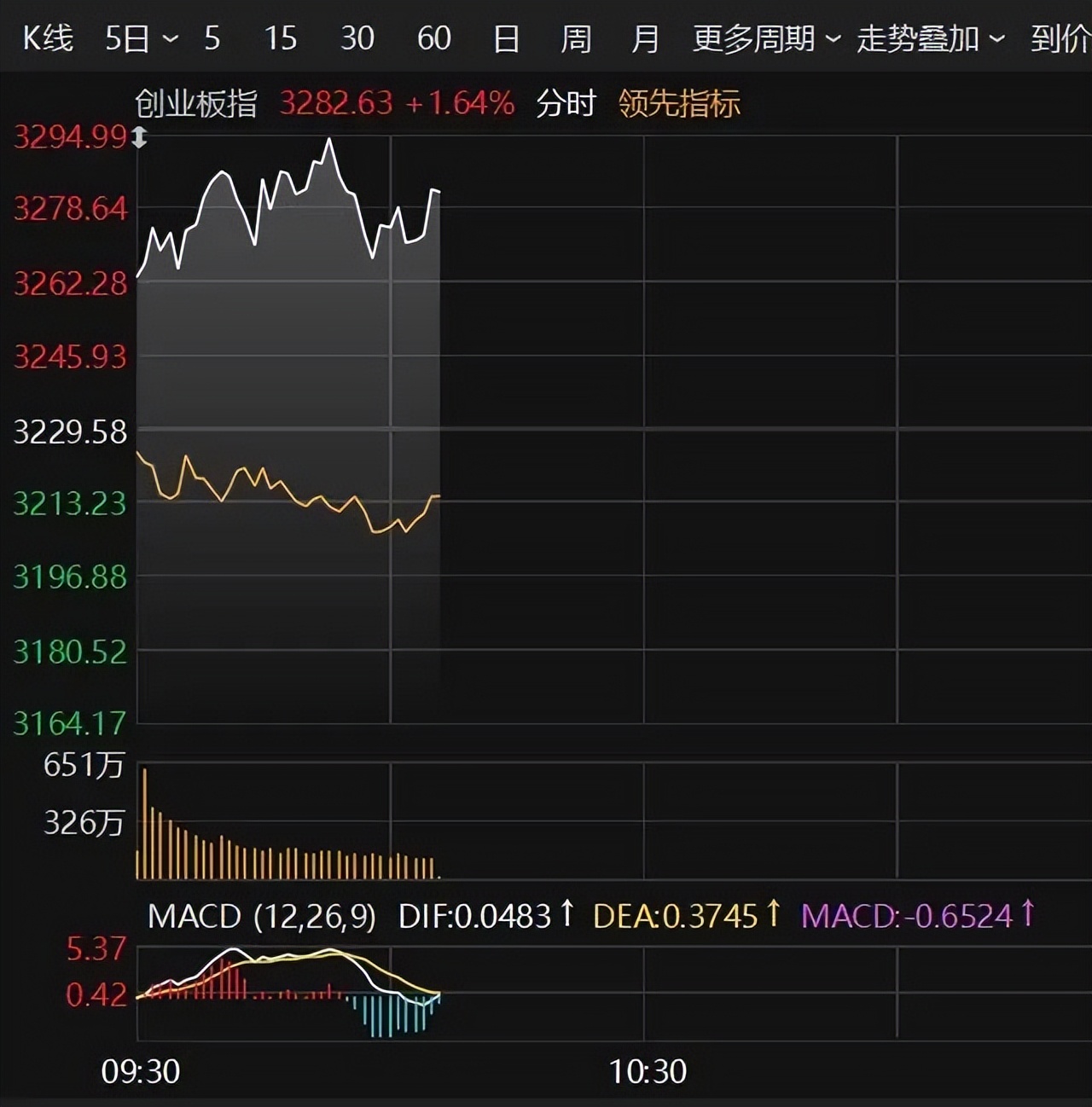 10月29日早盘,A股三大指数集体高开,沪指涨0.05%,深证成指涨0.40%,创业板指涨1.07%。开盘后表现有所分化,创业板指一度涨超2%,沪指盘中一度翻绿。