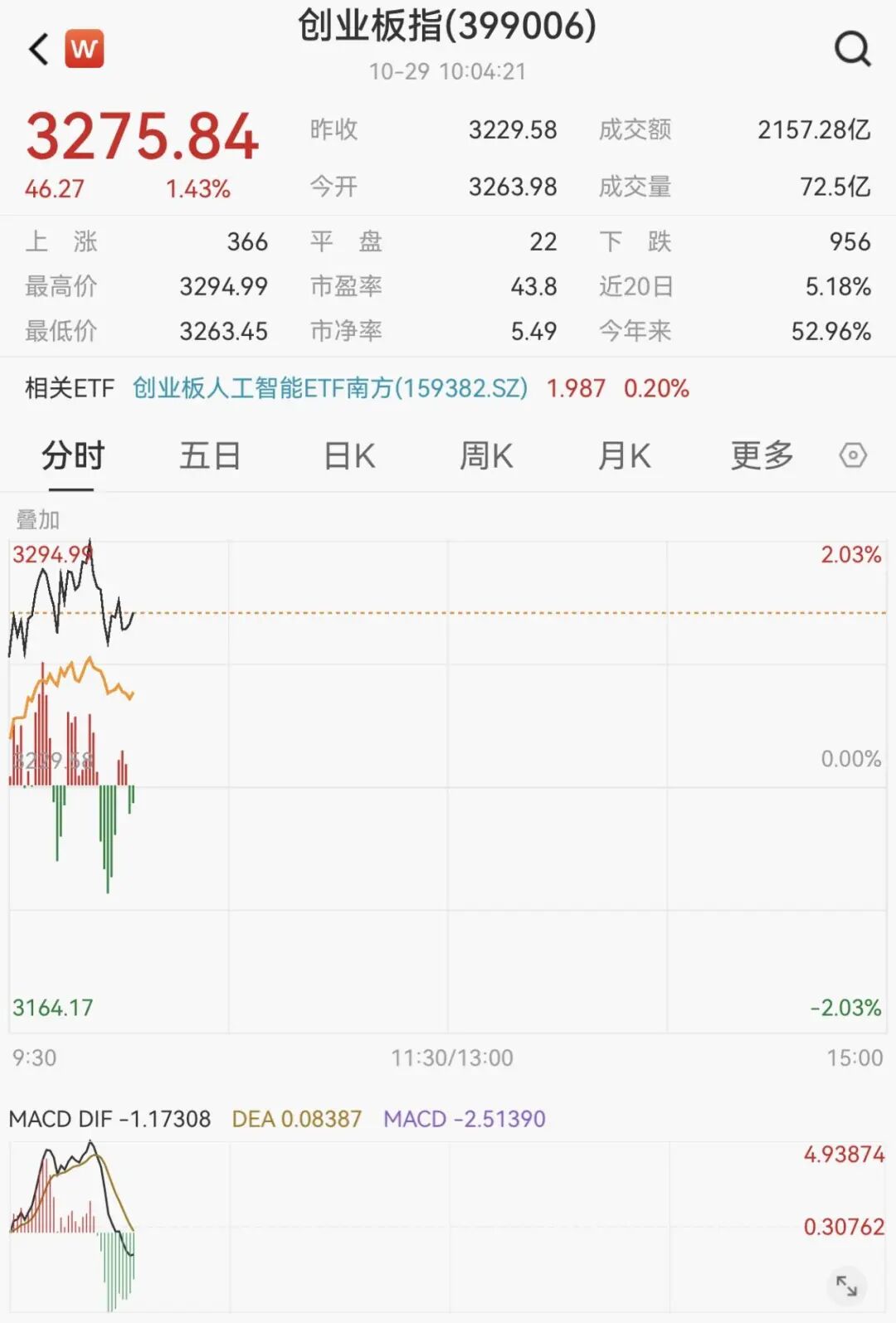 10月29日早盘,A股三大指数集体高开,创业板指一度涨逾2%。