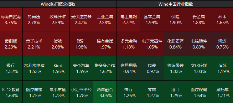 从板块上来看,海南自贸港、电工电网、电子元器件等方向涨幅居前;港口、零售、银行等板块震荡调整。