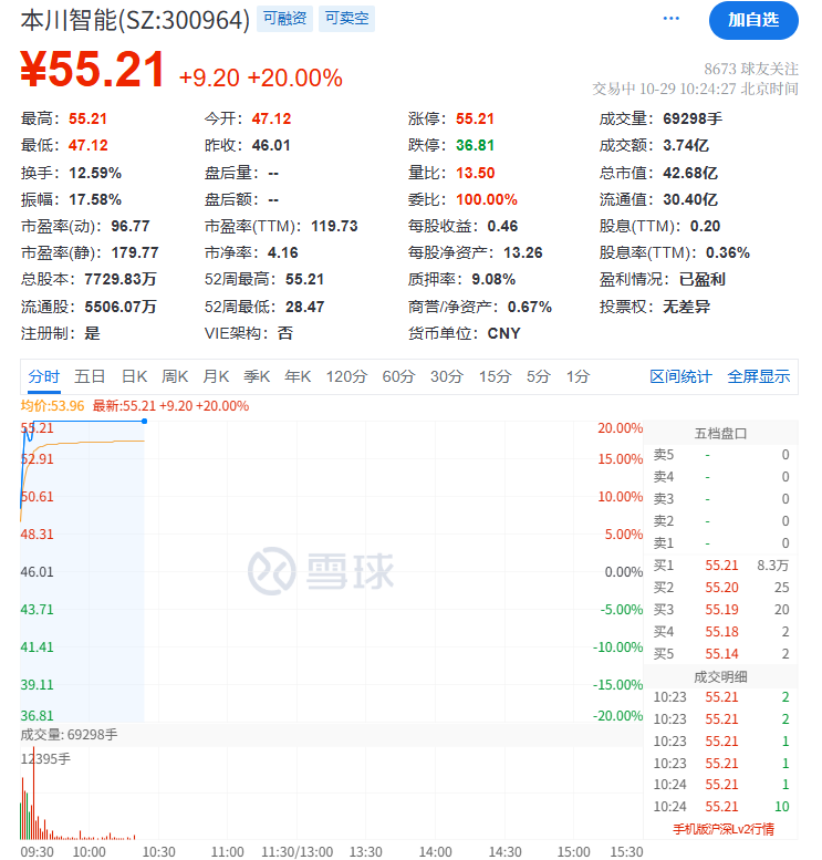 消息面上,10月27日晚间,本川智能发布三季度业绩公告称,2025年前三季度营收约6.14亿元,同比增加43.11%;归属于上市公司股东的净利润约3308万元,同比增加56.23%。