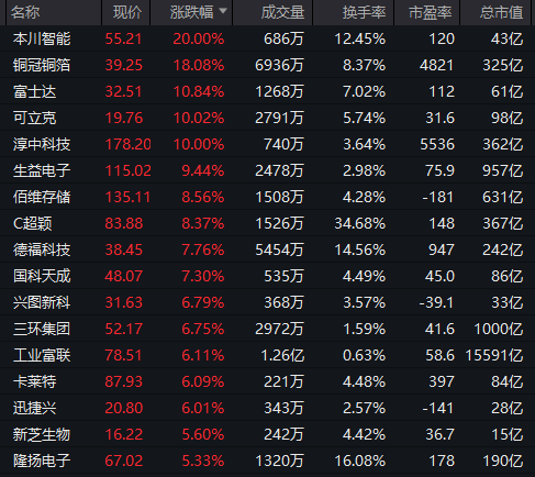 电子元器件板块走强,本川智能20%涨停,淳中科技涨停,铜冠铜箔、富士达、可立克涨超10%。