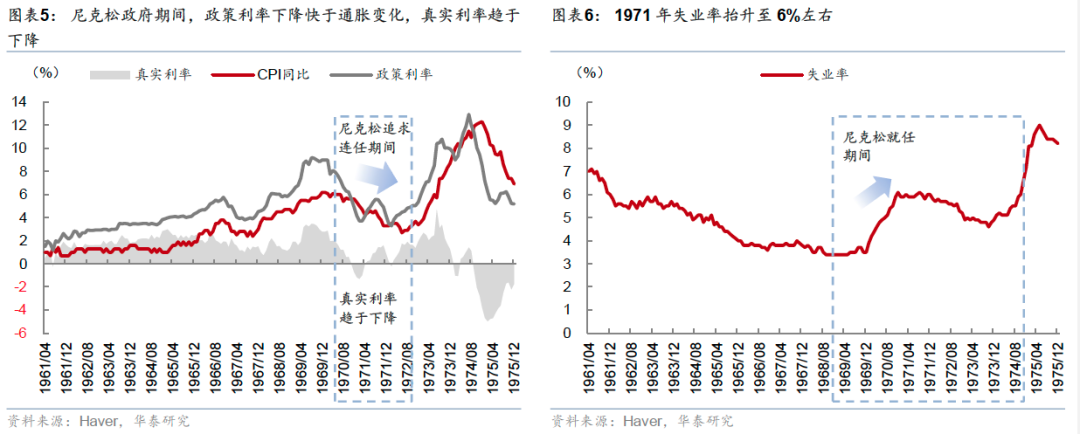 “滞胀”初现与1972年大选。1972年大选前夕,通胀率维持相对高位,1971年CPI同比维持在4%左右,失业率升至6%的高位,出现“滞胀”苗头(图表5-6)。尼克松将经济繁荣视为连任的关键,致力于刺激经济增长,要求伯恩斯(Arthur Burns)通过宽松政策推动经济繁荣。