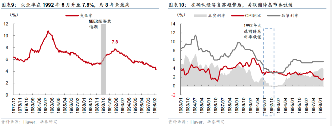 美国陷入温和衰退且复苏迟缓,1992年大选前经济疲软,阻碍布什总统连任。1990-1991年,美国经历了一场温和的经济衰退,衰退过后经济复苏步伐缓慢,呈现出“无就业复苏”(jobless recovery)的态势。失业率在1992年6月升至7.8%,为8年来最高 (图表9)。1992年总统大选临近,尽管布什总统此前在海湾战争后声望达到顶峰,但疲弱的经济状况却成为他寻求连任道路上的短板,选民对经济的不满情绪逐渐积累。