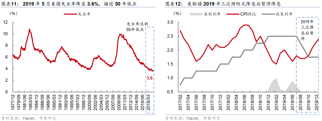 减税刺激与贸易摩擦交织,经济呈现复合背景。2018–2019年美国整体通胀温和,2019年5月失业率降至3.6%,接近50年低点(图表11)。2018年美国实施了1.5万亿美元减税政策,四季度经济表现好于市场预期,全年GDP 增长2.9%[16]。与此同时,贸易摩擦增加了美国经济的不确定性,研究估算受贸易摩擦影响2018年美国GDP减少约78亿美元[17];同时,美股也因为贸易摩擦升温而在2018年出现调整。特朗普希望“更快降息”来维持景气、对冲贸易摩擦冲击,但鲍威尔(Jerome Powell)认为经济基本面仍然稳健,反而在2018年继续加息。