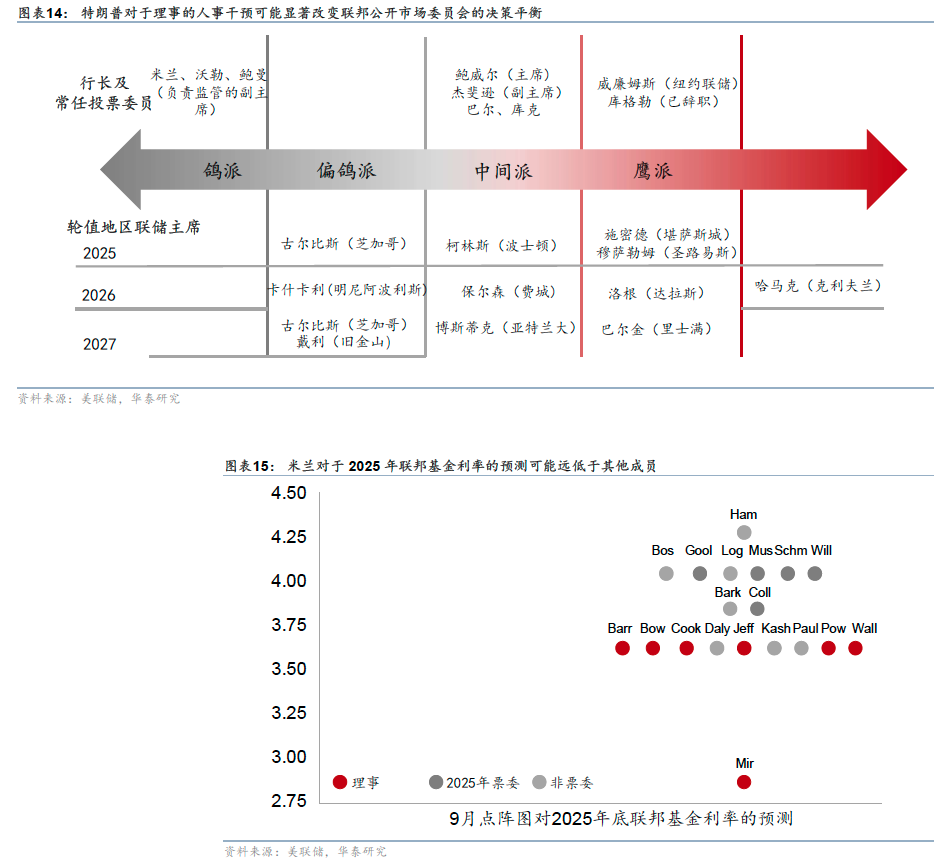 • 理事提名引发角色冲突,美联储理事库格勒(Adriana Kugler)意外提前退休后,特朗普提名米兰(Stephen Miran)担任新任理事,但米兰未辞去白宫经济顾问委员会主席职务,双重身份突破了联储决策与白宫立场间的“防火墙”,挑战美联储独立性的底线。米兰以“无薪休假”形式兼任美联储理事,成为1936年以来首位同时担任政府高级职务的美联储理事,其就任可能显著改变联邦公开市场委员会的决策平衡(图表14)。严格意义上,为保护联储独立性,白宫重要岗位在职官员不能兼任联储理事。历史上,美联储早年曾有财政部长兼任理事[26],自1935年《银行法》后,已免去财政部长等政府官员的理事席位,并未出现兼任的先例。米兰就任理事后的表现也显示其独立性可能受损。在9月议息会议中,米兰是降息25基点唯一的反对票,主张激进降息50基点,与特朗普政府“立即降息”的诉求高度一致,且其对于2025年联邦基金利率的预测[27]远低于其他成员(图表15)。