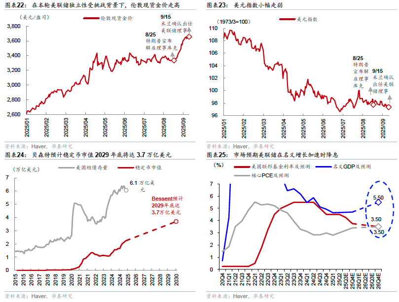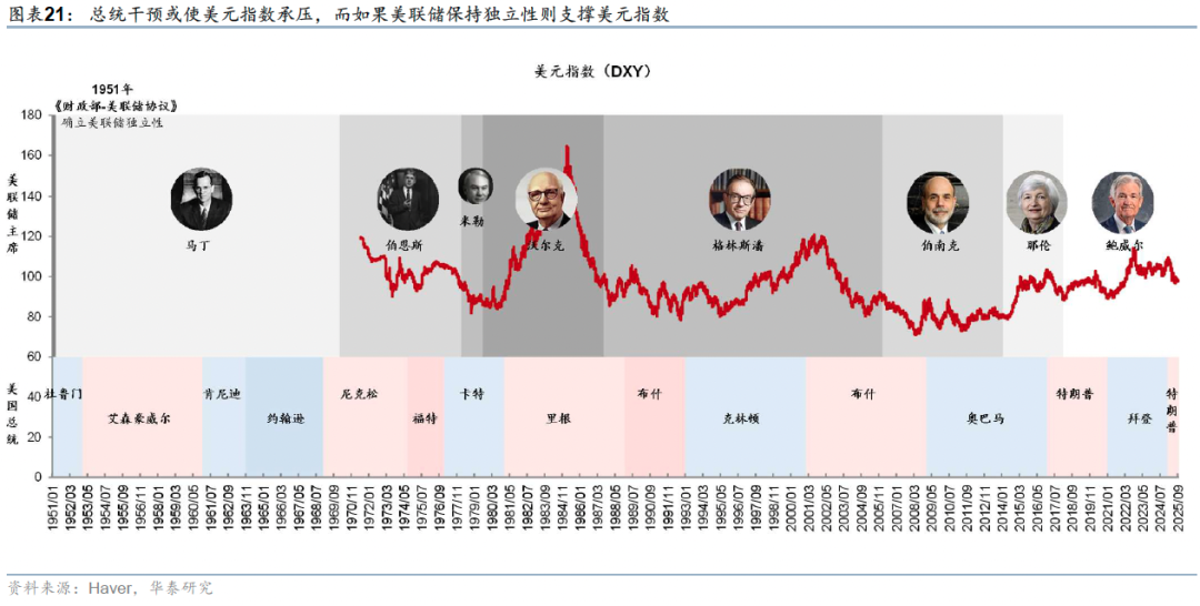 若货币条件过于宽松,虽然短期促进经济“繁荣”、推升资产价格,但假以时日,可能最终催生通胀和/或资产价格泡沫,为宏观环境和金融系统的稳定埋下隐患(参见《【华泰宏观|深度】美国的“双速经济”格局及其资产价格含义》,2025/10/22)。1980年后几经波折后基本确立的联储独立性是美元估值极其重要的“锚”,特朗普此轮对美联储的干预在手段、频率与系统性上均超越以往,市场已经开始定价美元作为法币公信力的结构性下降。公开施压人事更迭、提名立场鲜明的新理事,并配合行政令试图制度性弱化美联储独立性等行为不仅是1951年以来更直接、最系统的行政部门对美联储独立性的挑战,也已引发资产价格的重新定价——美元指数承压、黄金避险属性强化(图22-23)。