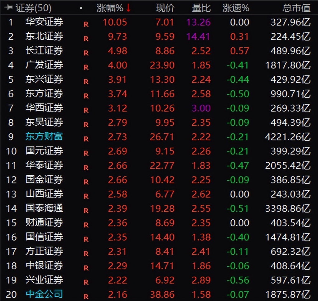 10月29日盘中,A股券商股集体拉升,华安证券强势涨停,截至午间收盘,东北证券大涨9.7%,长江证券、广发证券涨超4%,东方证券、东兴证券、华西证券涨超3%,东方财富、国元证券、国金证券、华泰证券、山西证券、国泰海通等券商股涨超2%。