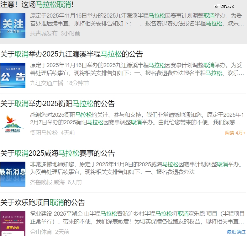 如山西临汾、湖南株洲、北京延庆等地的马拉松赛事相继宣布取消,广西桂林、武汉光谷、安徽池州等地宣布取消健康跑或迷你跑项目,广西南宁等地缩减参赛规模,四川西昌等地调整奖项设置等。
