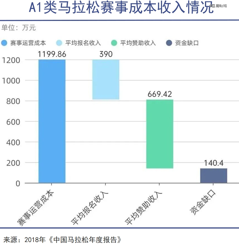 根据《中国马拉松年度报告(2018)》的数据,以A1级赛事为例,办一场赛事的平均运营成本约1199.86万元,即便算上报名费和赞助收入,还有100多万元的资金缺口,而这部分缺口基本要依靠政府补贴来填补。