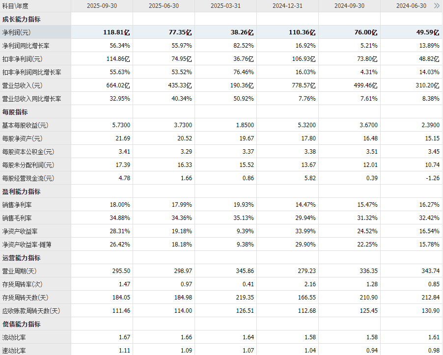 2、公司发布了2025年三季报。报告显示,公司前三季度和第三季度的业绩均呈现出良好的增长态势,第三季度实现营业收入228.69亿元,同比增长20.83%;归属于上市公司股东的净利润为41.47亿元,同比增长57.04%。