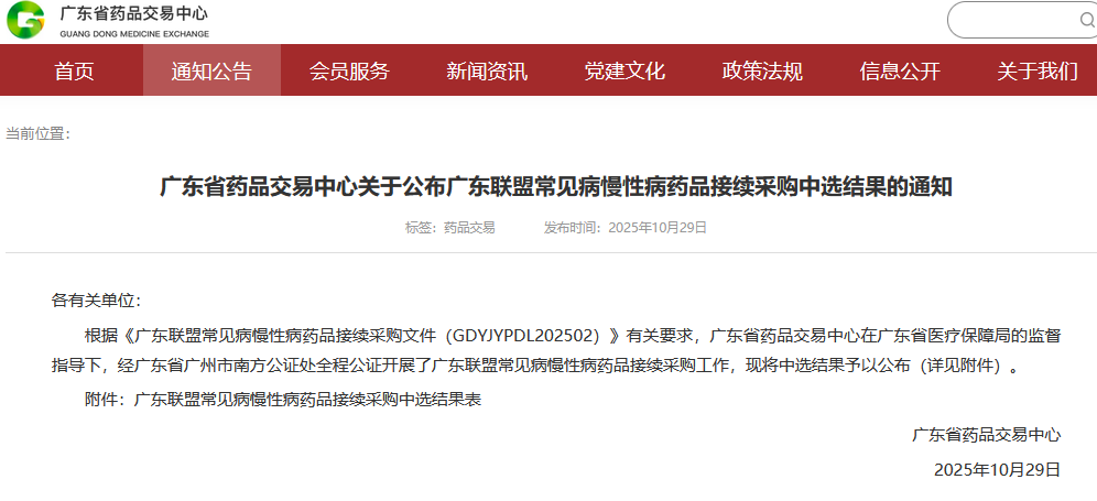 2025年10月29日,广东省药品交易中心正式发布通知,公布广东联盟常见病慢性病药品接续采购中选结果。这一备受医药行业关注的采购项目终于尘埃落定,标志着广东联盟在药品集中采购领域的又一重要进展。