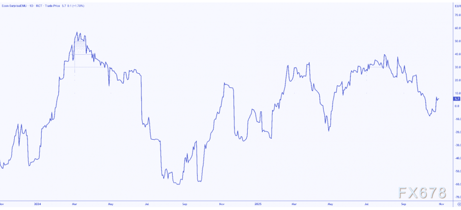 考虑到宏观背景,这样的走势并不意外。只需观察下图花旗经济意外指数追踪的欧洲近期数据走势:该指数微幅处于正值区间,表明近期经济数据普遍超出预期上行,并未出现需要进一步政策刺激的快速恶化迹象。