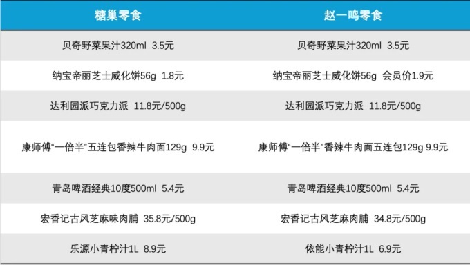 例如,糖巢和赵一鸣所售的300ml瓶装百事可乐可口可乐均售价1.5元、纳宝帝丽芝士威化饼散称价格均为15.8元/500g、喜力经典啤酒500ml一罐售价均为6.9元。