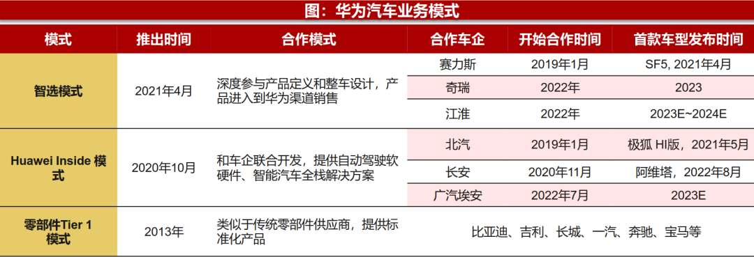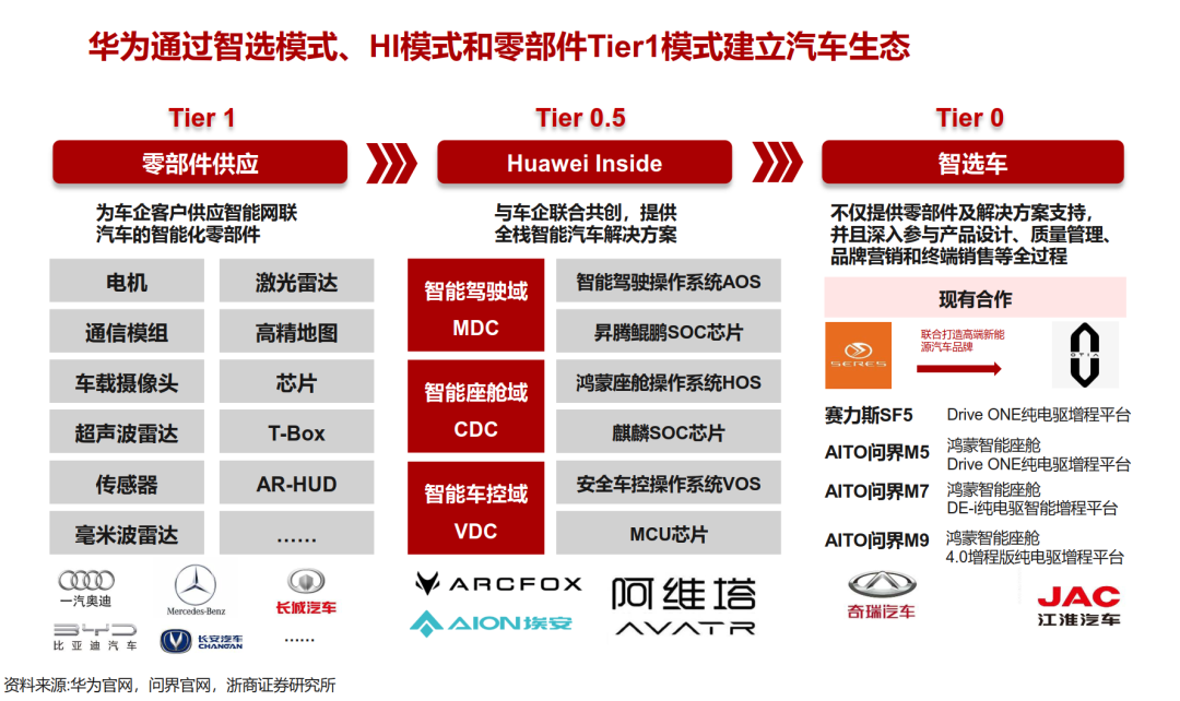 但更多车企囿于智选模式中,华为的参与车型研发过于深入,选择的是华为Huawei Inside模式,即车企和华为联合开发,华为提供自动驾驶软硬件、智能汽车全栈解决方案;更多的车企则选择零部件Tier1模式,即华为充当传统零部件供应商,提供标准化产品,这种模式下,包含比亚迪、吉利、长城、一汽、奔驰、宝马等传统车企。